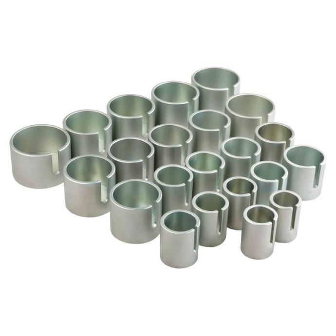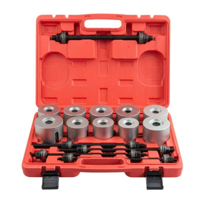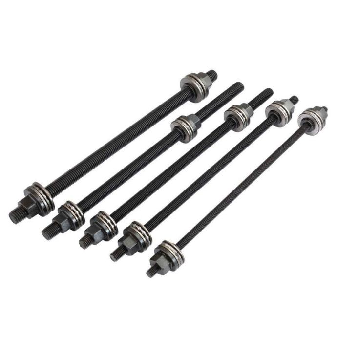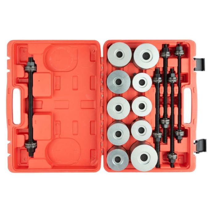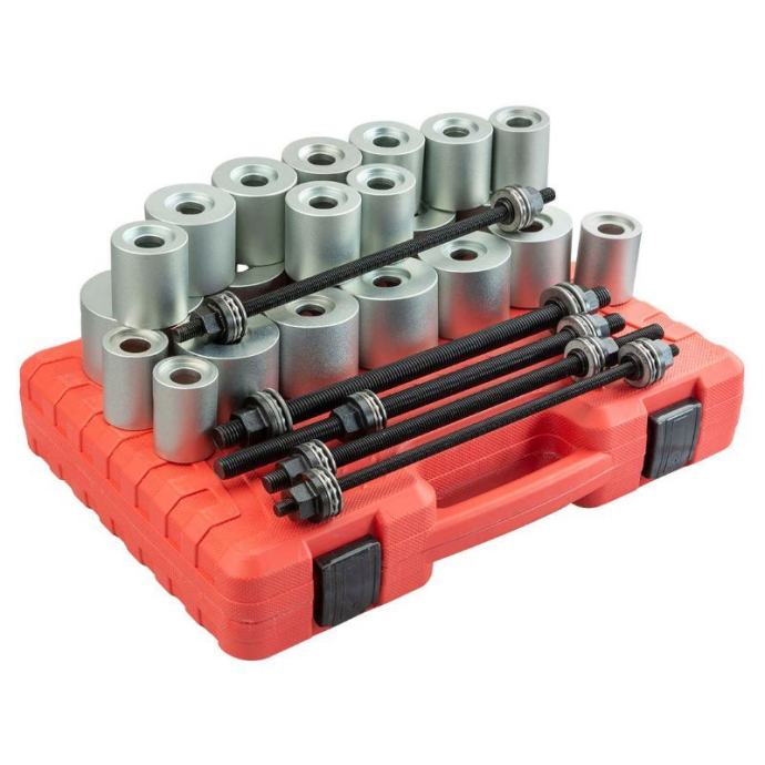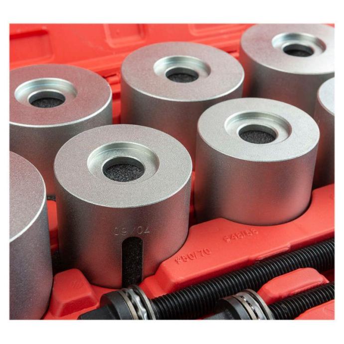 Ovaj set alata omogućuje jednostavno sastavljanje i rastavljanje komponenti ovjesa izravno na automobilu, što je posebno korisno pri demontaži dijelova ovjesa osobnih vozila. Namijenjen je za radove kao što su utiskivanje, valjanje, pritiskanje i stiskanje različitih dijelova ovjesa. Set se može montirati na hidrauličnu prešu, čime se olakšava i ubrzava rad. Namijenjen je za rukovanje s različitim vrstama ležajeva i brtvenih prstenova, uključujući gumene prigušne ležajeve, hidrauličke ležajeve, kuglične ležajeve i druge slične dijelove. Tehnički podaci uključuju: - 5 izvlakača različitih dimenzija (M10 do M18, svi dugi 350 mm) - Ojačane adaptere s vanjskom visinom od 60 mm i širokim rasponom vanjskih i unutarnjih promjera, što omogućuje prilagodbu različitim komponentama ovjesa. Ovaj alat je idealan za mehaničare i radionice koje redovito rade na ovjesima osobnih vozila, jer omogućuje preciznu i sigurnu demontažu i montažu dijelova bez potrebe za njihovim potpunim uklanjanjem s vozila.