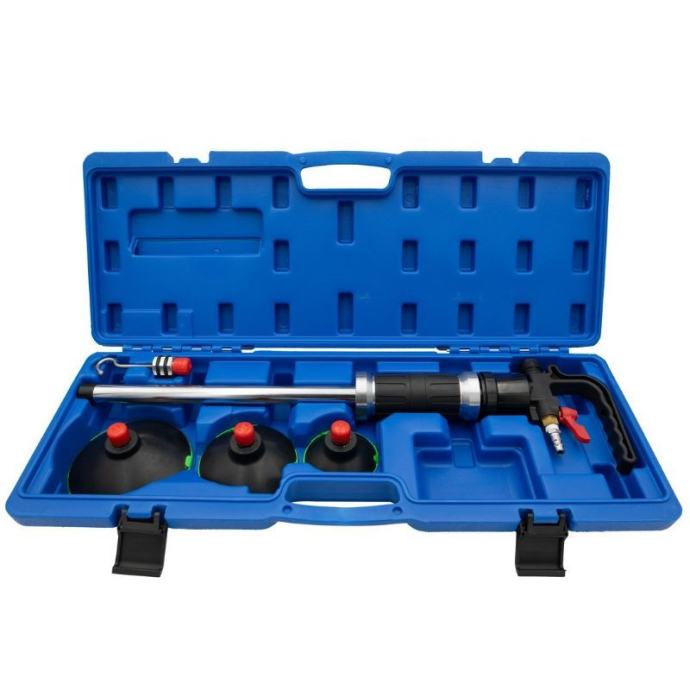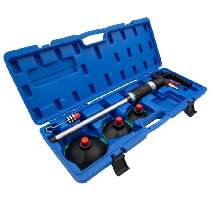 Pneumatski alat za brzo i učinkovito uklanjanje udubljenja na vozilima bez potrebe za brušenjem, popunjavanjem ili ponovnim bojanjem. Ugrađeni klizni čekić omogućuje precizan prijenos sile za izvlačenje malih i srednjih udubljenja. Set sadrži 5 dijelova i radi na radnom tlaku od 6,2 do 10,3 bara, s vakuumskim čašicama promjera 75 mm, 100 mm i 125 mm.