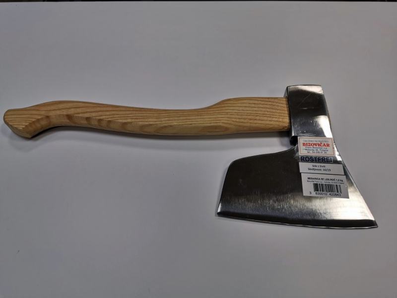 Profesionalna mesarska sjekira od nehrđajućeg čelika, težine 1.5 kg, namijenjena za mesarske poslove.