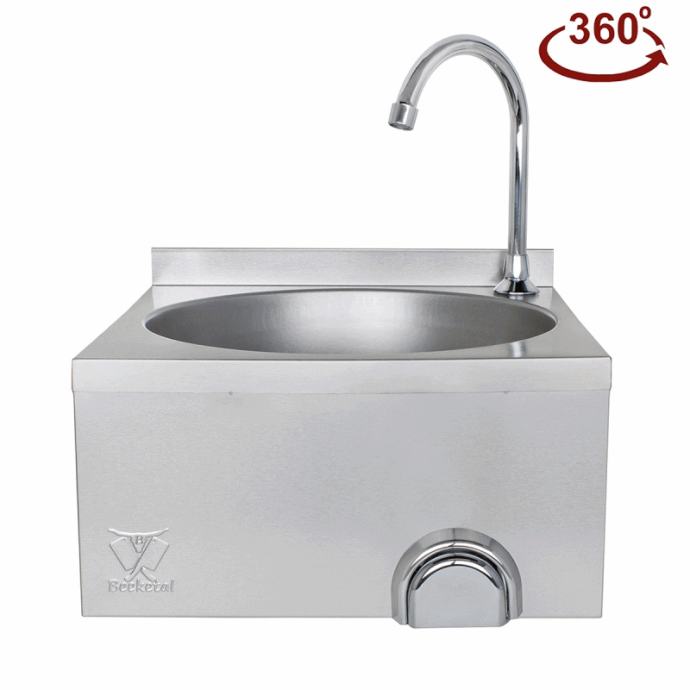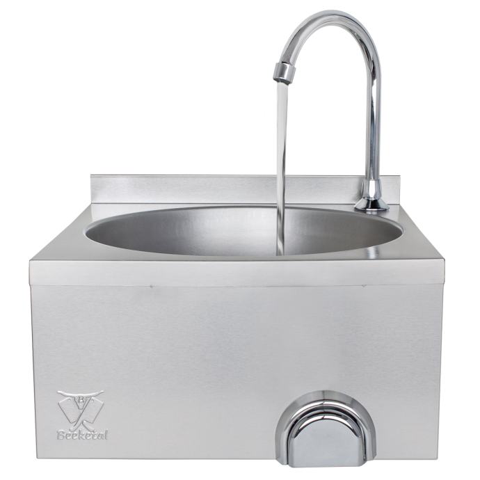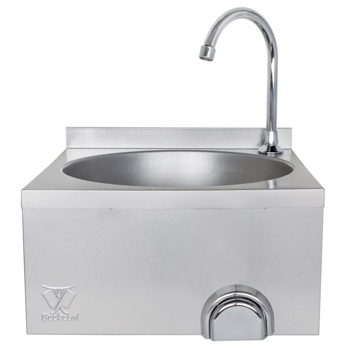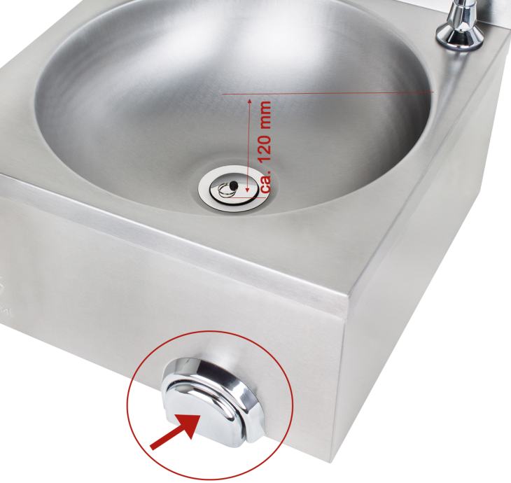 Model HWB je umivaonik s mehaničkom slavino upravljanom koljenom, izrađen od nehrđajućeg čelika. Dimenzije su približno 400 x 425 x 450 mm, a bazen ima dimenzije oko 350 x 120 mm. Povezuje se s vodovodnom cijevi od 1/2" i teži oko 4,4 kg. Ovaj proizvod je higijenski i idealan za restorane, poslovne kuhinje, kantine i bolnice. Uključuje umivaonik, slavinu, fleksibilna crijeva, pribor za montažu, tipku za upravljanje, odvod, čep za odvod, sifon i mehanički miješajući ventil.
