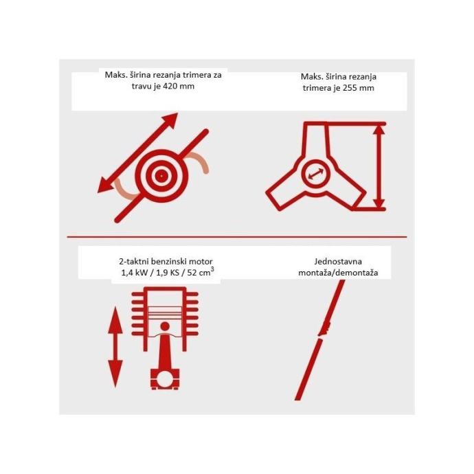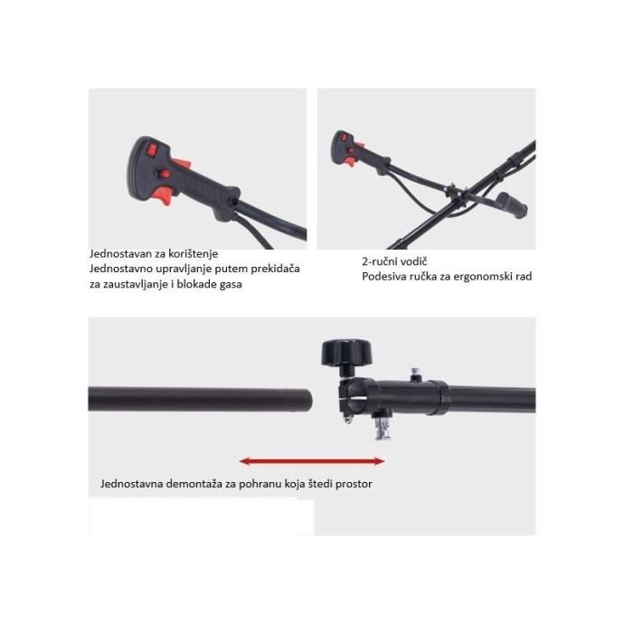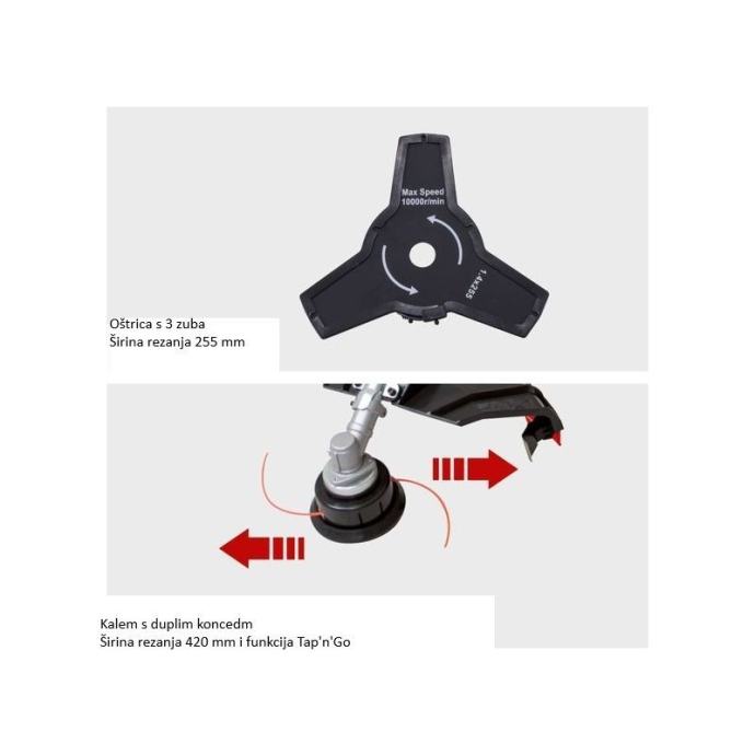 -Benzinski trimer PBC520, 1,4 kW, 1,9 KS je benzinski frezač/trimera koncepta “struna + nož” za košnju visoke trave i čišćenje gušćeg raslinja -Motor je dvotaktni, zapremnine 52 cm³, s rasponom brzine 2700–10.000 o/min i praznim hodom 3100 o/min (tolerancija 400 o/min) -Omjer mješavine ulja i benzina je 1:40, kompatibilno s E10 gorivom, emisijski razred Euro V -Za košnju rubova i travnjaka koristi se rezni sustav sa strunom, sa širinom košnje 420 mm -Za gušći materijal koristi se nož sa širinom košnje 255 mm -Upravljanje je izvedeno preko ručke u stilu bicikla s dvoručnim vođenjem i remenom za rame za bolju kontrolu na većim površinama -Emisija CO² je 830,2 g/kWh Naziv Benzinski trimer Model PBC520 Vrsta pogona Motor s unutarnjim izgaranjem Podgrupa vrste pogona Dvotaktni motor Snaga 1,4 kW / 1,9 KS Zapremnina 52 cm³ Brzina motora (min.–maks.) 2700 – 10.000 o/min Brzina praznog hoda 3100 o/min Tolerancija praznog hoda 400 o/min Širina košnje (struna) 420 mm Širina košnje (nož) 255 mm Spremnik goriva 1,2 l Omjer mješavine ulje/benzin 1:40 Kompatibilno s E10 Da Emisijski razred Euro V Emisija CO² 830,2 g/kWh Dimenzije (D × Š × V) 1840 × 610 × 290 mm Neto težina 8,37 kg Bruto težina 10,18 kg Vrsta startera Seilzug (potezni starter) Hlađenje Zrak Dostava: 18 € Kontakt: 0976260271 E-mail: idealalati@gmail.com