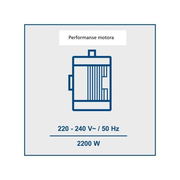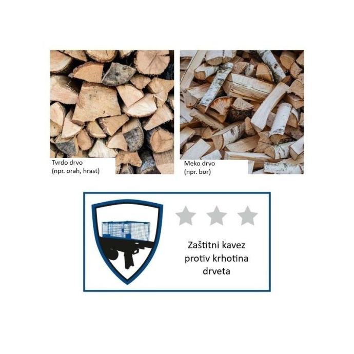 Horizontalni cjepač drva HL760L sa silom cijepanja 7 t i motorom 2200 W na 230 V. Prima trupce do 52 cm duljine i Ø 25 cm, hidraulički tlak 20,8 MPa i automatski povrat cilindra. Horizontalni cjepač drva HL760L je električni hidraulički cjepač za ogrjevno drvo, projektiran za trupce duljine 200–520 mm i promjera 50–250 mm. Sila cijepanja je 7,0 t, a hidraulički sustav radi na tlaku 20,8 MPa uz količinu ulja 3,5 L. Hod cilindra je 370 mm. Brzina kretanja prema naprijed je 30,8 mm/s, a brzina povratka 52,9 mm/s. Pogon je indukcijski motor s potrošnjom 2200 W (način rada 1), maksimalnom brzinom motora 2800 o/min i nazivnom strujom 9,6 A. Napajanje je 220–240 V / 50 Hz. Električna zaštita je IP54, a duljina kabela 5000 mm. Termička zaštita motora je prisutna. Radni sklopovi su definirani dimenzijama: klin 80 × 70 × 126 mm, nagib klina 4°, tlačna ploča 105 × 95 mm. Stroj je opremljen kotačima promjera 150 mm (širina 35 mm) s tragom 240 mm, što olakšava premještanje. Razina zvučnog tlaka je 78,8 dB. Dimenzije stroja su 1160–1295 × 425 × 615 mm (ovisno o položaju). Naziv artikla Horizontalni cjepač drva HL760L, 7 t, 2200 W, 230 V Model HL760L Tip Cjepač drva, horizontalni Sila cijepanja 7,0 t Maks. duljina trupca 520 mm Min. duljina trupca 200 mm Maks. promjer trupca 250 mm Min. promjer trupca 50 mm Hod cilindra 370 mm Brzina naprijed 30,8 mm/s Brzina povratka 52,9 mm/s Hidraulički tlak 20,8 MPa Količina ulja 3,5 L Klin za cijepanje (D × Š × V) 80 × 70 × 126 mm Kut nagiba klina 4° Tlačna ploča (D × Š) 105 × 95 mm Motor Indukcijski Potrošnja (način rada 1) 2200 W Napon 220–240 V Frekvencija 50 Hz Nazivna struja 9,6 A Maks. brzina motora 2800 o/min Električna zaštita IP 54 Duljina kabela 5000 mm Razina zvučnog tlaka Lp(A) 78,8 dB Kotači Ø 150 mm, širina 35 mm, trag 240 mm Dimenzije stroja (D × Š × V) 1160–1295 × 425 × 615 mm Neto masa 52,8 kg Bruto masa 55,4 kg