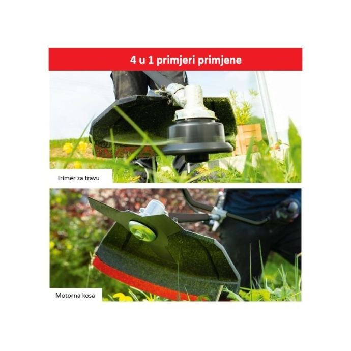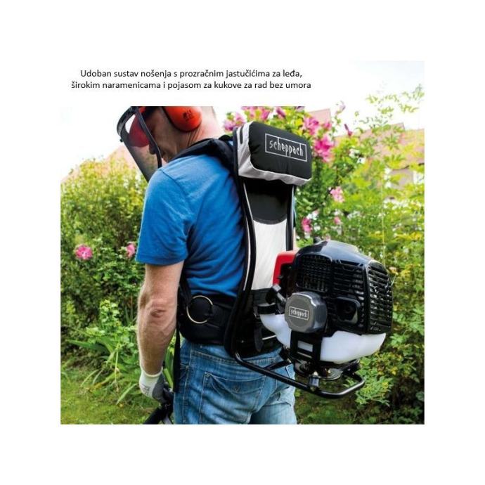 Ovaj ruksak-trimer omogućuje nošenje motora na leđima što rasterećuje ruke i olakšava rad iznad ramena. Ima prigušen okvir za vibracije, podstavljena leđa, široke naramenice i pojas za kukove za stabilniji rad. Pogoni ga 2-taktni motor 51,7 cm³ s spremnikom goriva 0,96 L. Mehanizam brzog otpuštanja omogućuje jednostavnu promjenu nastavaka. Uključeni su nastavci za različite poslove: trimer za travu, metalna oštrica za gušći korov, škare za živicu s podešavanjem kuta i pila s lancem za orezivanje grana s automatskim podmazivanjem.