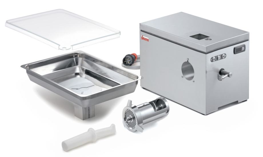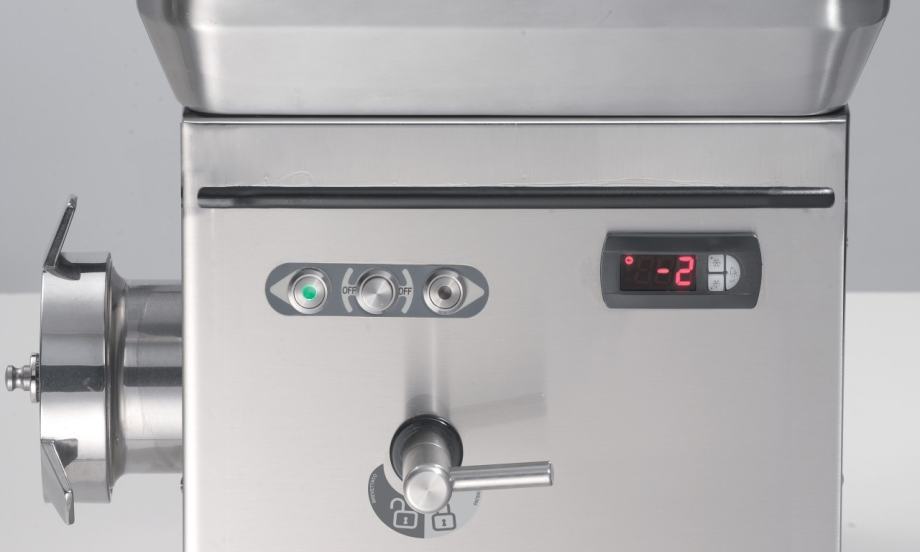 Profesionalni mlin za mljevenje mesa izrađen od nehrđajućeg čelika AISI 304 s snažnim motorima i hlađenjem za kontinuirani rad. Opremljen je motorom s uljnom kupkom i dvostrukim brtvljenjem za dug vijek trajanja. Sadrži praktičan mehanizam za zaključavanje glave, kvadratni lijevak za visoke performanse, te kontejner sa sigurnosnom bravom. Kontroleri su zaštićeni IP67 standardom, a uređaj ima ugrađeni hladnjak. Mogućnost dodatne opreme uključuje zaštitu za ploče s rupama većim od 8 mm, različite sustave mljevenja i poklopac za posluživanje mesa.