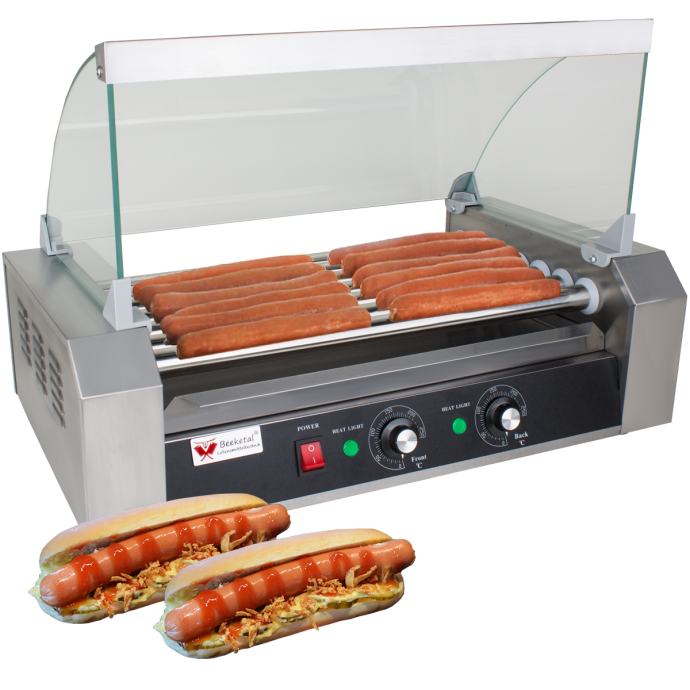 Valjak za pečenje hot dogova s rotirajućim valjcima i modernim dizajnom. Kućište i grijaći valjci su od nehrđajućeg čelika. Uređaj ima ladicu za ispuštanje masnoće i staklenu zaštitnu kutiju. Tehničke karakteristike: 1 cilindar, promjer 12 mm, dimenzije 580x480x425 mm, snaga 2200W, napajanje 230 V, težina 17 kg.